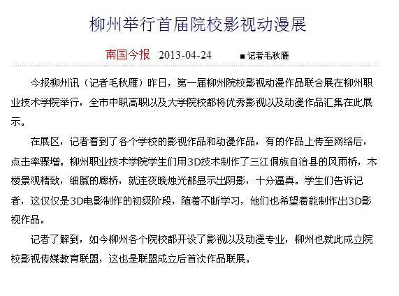 南国今报刊发我院艺术设计系企业开放周之影视动漫展的新闻 来源:未知 发布时间:2013-04-24 00:00:00 浏览次数: 次 【字体:小 大】 南国今报2013年4月24日第6版以“柳州举行首届院校影视动漫展”为题,刊发我院艺术设计系企业开放周之影视动漫展的新闻。(黄芳) 分享到: 【打印正文】