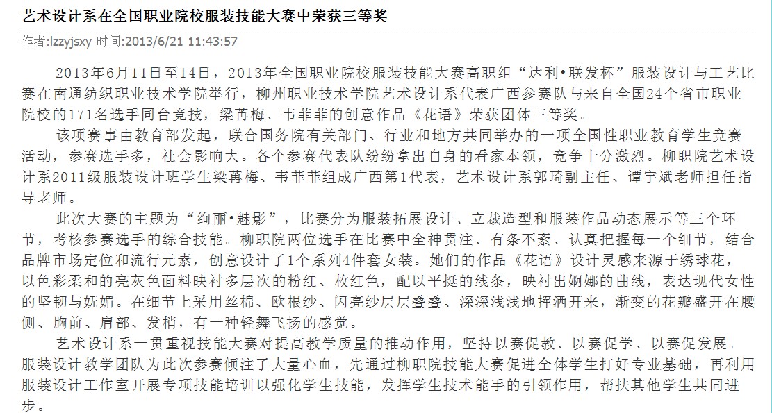 柳州教育局网站发布我院艺术设计系在全国职业院校服装技能大赛中 来源:未知 发布时间:2013-06-21 05:15:00 浏览次数: 次 【字体:小 大】 2013年6月21日,柳州教育局网站在职教动态版块发布我院艺术设计系在全国职业院校服装技能大赛中荣获三等奖的信息。(崔智慧) 分享到: 【打印正文】
