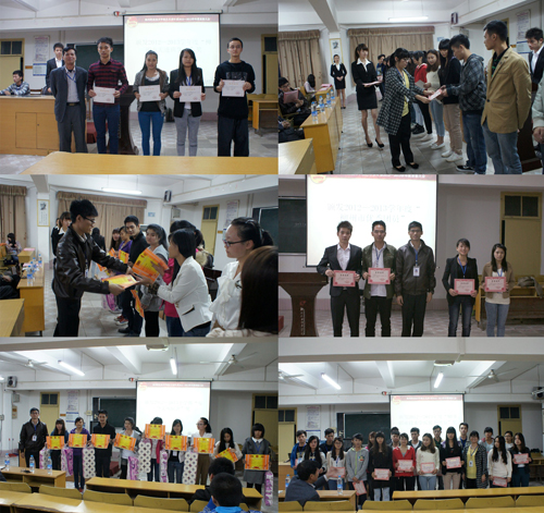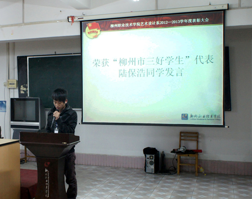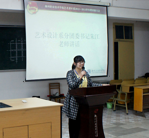 艺术设计系2012—2013学年表彰大会于2013年10月21日晚7:30在南校区举行,表彰大会以“锐意进取,开拓创新”为主题,颁发了2012年度柳州市“先进基层团组织”和 2012—2013年度“柳州职业技术学院优秀宣传员”等十多个市级和学院的奖项,181名同学和17个集体受到表彰。 会上,系党总支书记梁毅对系部一年来的学生工作成绩给予了充分肯定,勉励大家继续努力,再创辉煌。“柳州市三好学生”代表陆保浩同学发表了获奖感言,表示今后将继续热情服务同学、认真学习、积极工作,回报老师的栽培。团委书记朱江鼓励获奖同学再接再厉,为身边同学树立榜样,齐心协力使系部学生工作迈上新台阶。 本次表彰大会明确了系部学生工作的任务,为今后的学生工作指明了方向,会议鼓励师生们在学生工作领域不断进取、努力创新、取得更大进步。(文/张桂 图/陆保浩、许正会)