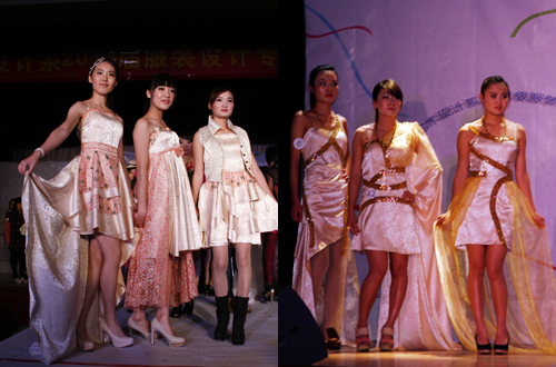三年勤学结硕果,一朝圆梦谱华章。2013年12月15日晚7:30,艺术设计系2014届服装设计专业毕业生们在南校区大礼堂圆了三年来的梦想,“2014届服装设计班毕业设计作品展演”顺利举行,童装、创意装、礼服、婚纱、成衣等29个系列136套作品的精彩演绎,赢得了观众们一次又一次热烈的掌声,时装秀、歌舞表演、情景剧表演在寒冬热闹上演,忽如一夜春风来,千树万树梨花开。    参展的每一件作品都汇聚了老师们的辛勤汗水,凝聚了毕业生们的大量心血,闪耀着未来设计师的智慧光芒。艺术设计系服装专业教学团队近两年来改革课程教学内容,将民族民俗文化、前沿时尚潮流、品牌商业价值渗透课堂,并建立市场意识。从9月初的设计草图构想到11月底服装的制作完成,每个同学都没有松懈,一些系列作品设计稿甚至修改了5次。制作出的成品如果结构不满意,又一次次修改,“我们一定能做得更好”这样的理念支持着师生们去精心完成每一件服装作品。    一边是紧张的服装制作,一边是紧锣密鼓的展演筹备。11月中旬展演筹备开始,服装团队负责人将同学们分为模特组、宣传组、外联组、机动组和后勤组五个工作小组,承担展演的分工工作。同学们利用中午时间进行模特训练,宣传组负责海报设计及各方面的宣传准备,外联组完成了拉赞助的事情,机动组着手舞台的布置和相关设备租借,后勤组根据需要购买材料并协助老师将作品整理好。各项工作有条不紊地进行,3次彩排也为展演的顺利进行奠定了基础。    当晚,师生们把数月辛勤劳作的成果精彩呈现,展现了服装的魅力和同学们绚丽多姿的梦想!(文/陆进 图/阎志斌)