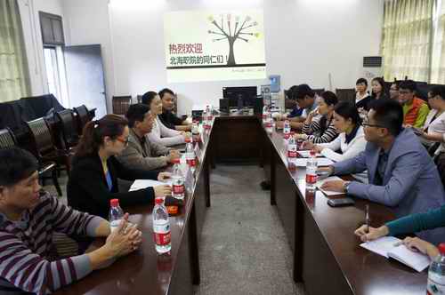 新闻网消息(通讯员 艺术系 郭琦 摄影 廖桂英、阎志斌)11月28日下午,北海职业学院文化与传媒系副主任余添一行17人,到我院考察交流。艺术设计系书记梁毅、副主任雍佳、郭琦,率部门工作人员及相关专业团队负责人热情接待了来访客人。