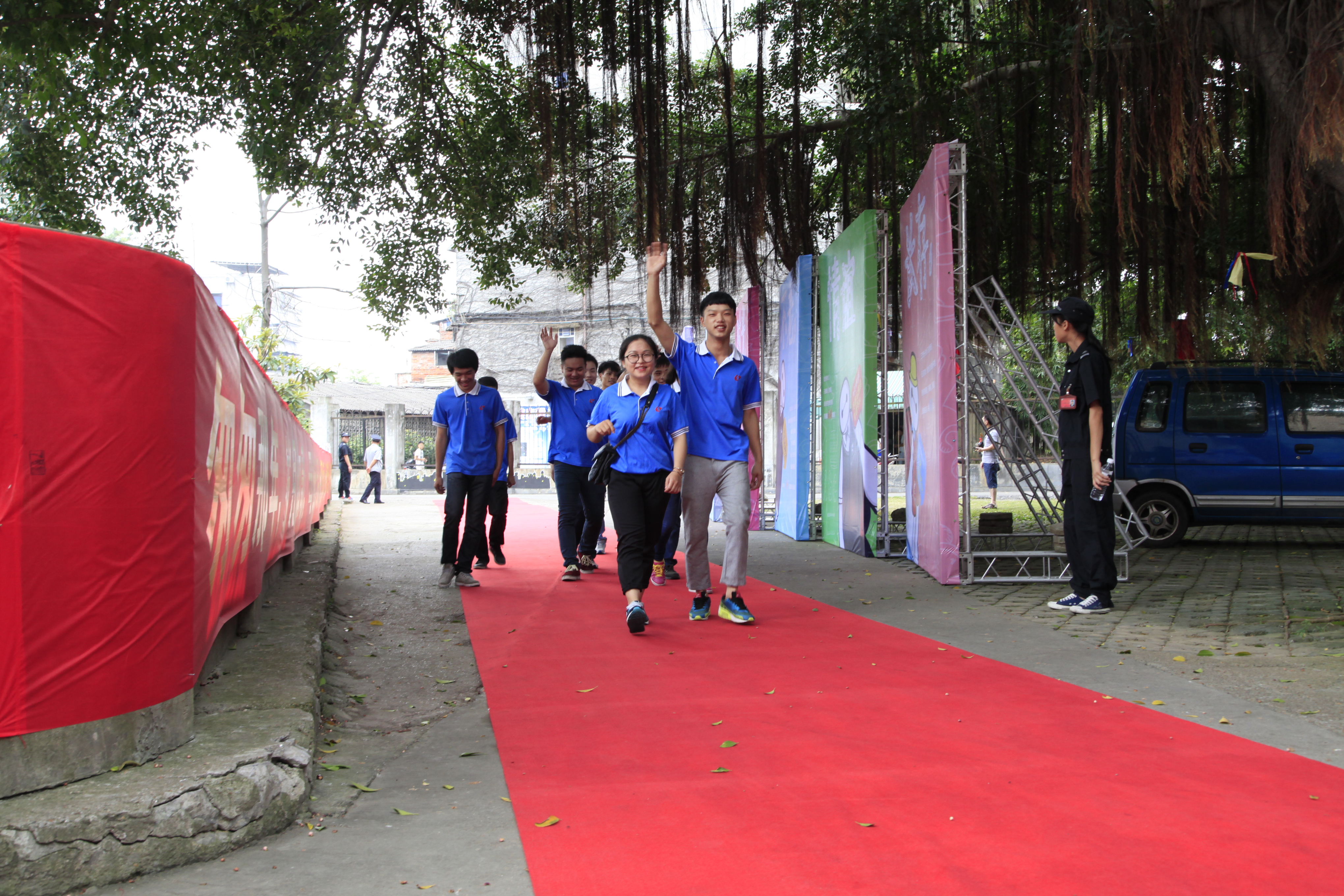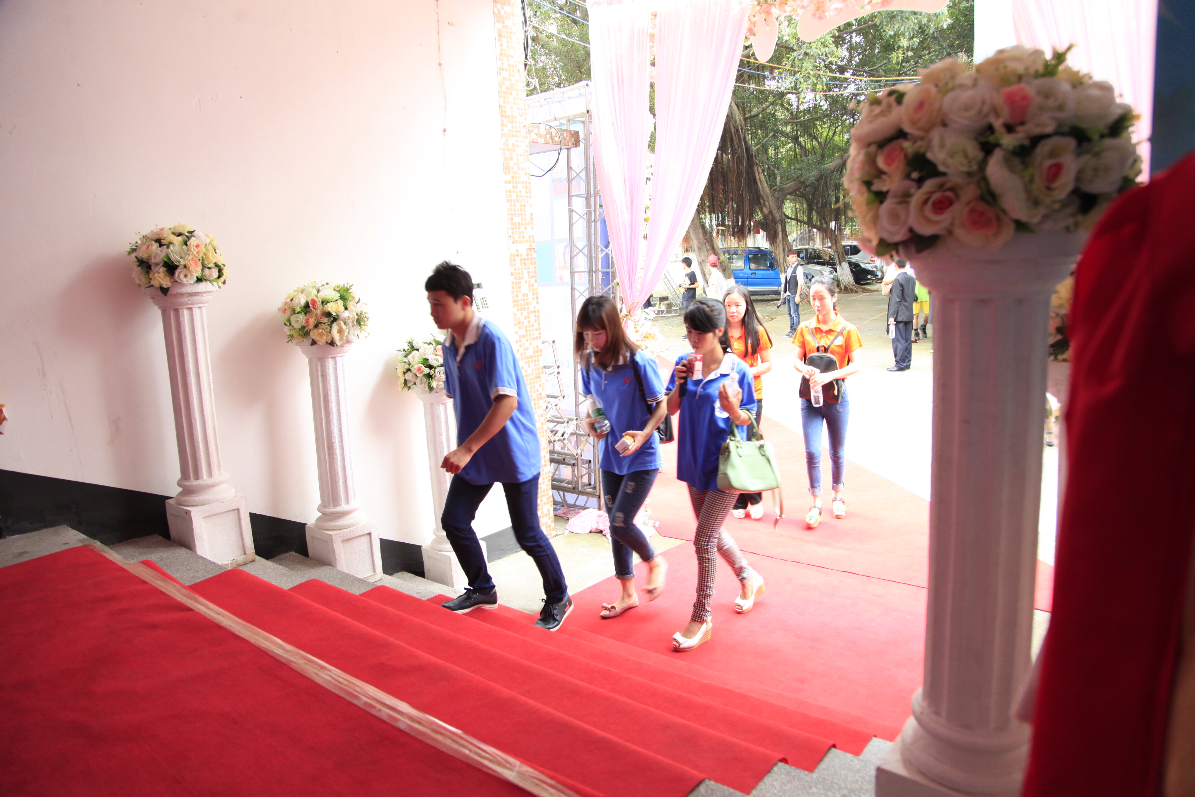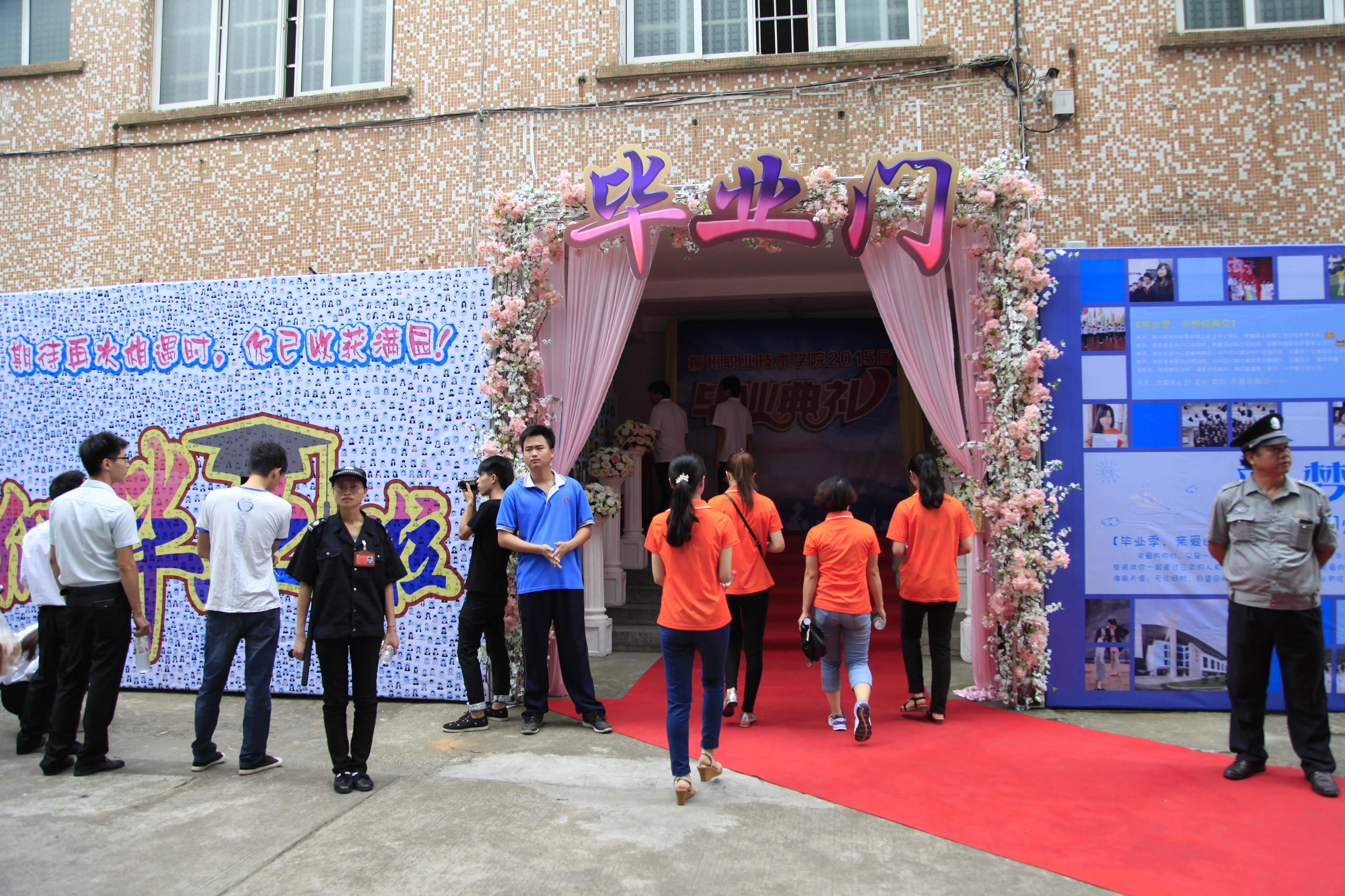 一进南校区大门,一幅巨型喷绘上 “我们毕业了!”几个大字不由分说地映入眼帘。画面上一粒种子期待着破土发芽、开花结果。种子上方有房子、有星星、月亮和太阳,喻示着毕业生们结束学业迈向锦绣前程。种子下方是柳职院的代表性建筑,意味着柳职院是毕业生们的坚强后盾和家。校道左侧,三条红色横幅一溜烟排过去,分别写着“今天桃李芬芳学子闯天下,明日社会栋梁母校侯佳音。”“母校永远是你的家,记得常回家看看。”“将文明留给母校,将感激留给老师,将关心留给同学,将信心留给自己。”一句句,一声声,都传递着不舍的离情。既有学校的期待,又有老师的叮咛,更有互相的鼓励。 接近礼堂时,代表7个教学系部的七色憨态可掬的“大白”带着萌萌的表情向人们致意,一句“不管你走到哪里,这里永远是你们的家”仿佛家人的叮咛。然后红毯从离礼堂台阶50米开外的距离一直铺展到礼堂内。毕业生们远远地从红毯走过来,宛如影星在奥斯卡颁奖典礼上挥手亮相的体验,喜庆而志得意满——这也是此次盛典的亮点之一 喻意着“桃李满天下”的毕业门,缀满了粉红色的桃花和洁白如玉的李花,甜蜜、温馨而浪漫。毕业门左侧是由1700余名毕业生剪影镶嵌成的巨型喷绘,配有文字“毕业了,期待再次相遇时,你已收获满园。”代表了学校的希望和老师们的期待。毕业门右侧是学生们平时学习、开展社团活动、实习及工作的一幅幅难忘的掠影。进了毕业门的左侧墙上,是2015年我院获得“自治区优秀毕业生”荣誉称号的35名毕业生的肖像。 沉浸在这样热烈而隆重、温馨而伤感的氛围渲染中,哪一种情绪被激发出来,都在意料之外,又在情理之中。
