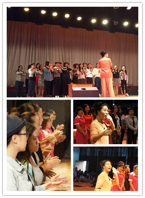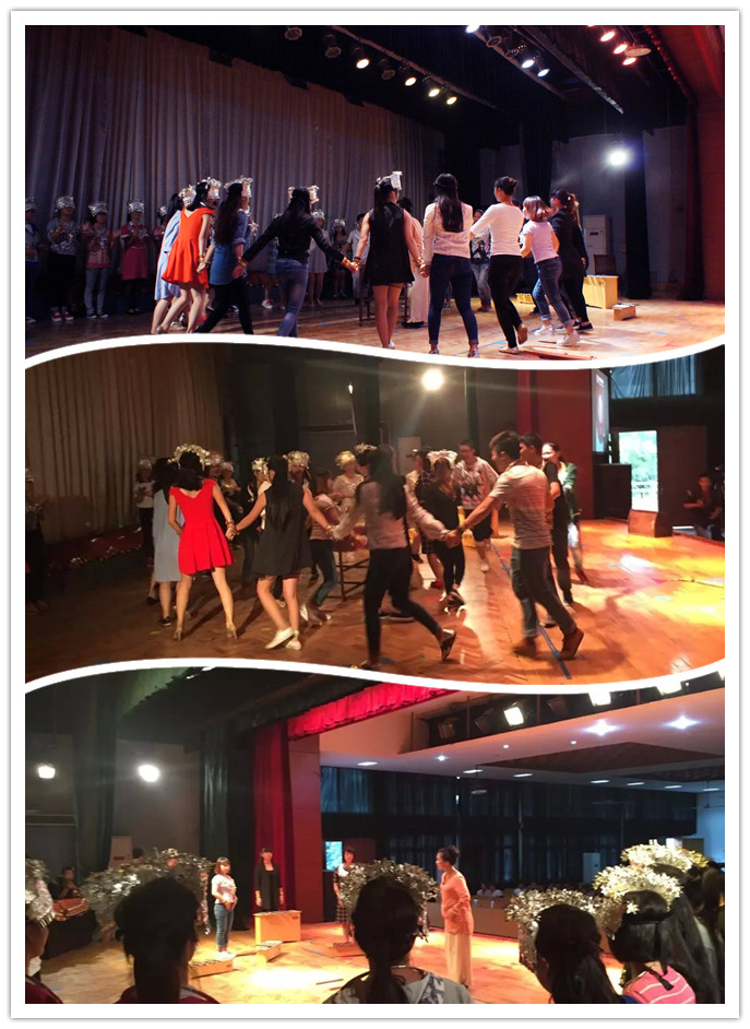 在先声夺人的吆喝声和隆隆鼓声中,工作坊教学拉开了帷幕。周老师说:“在我的鼓声停下来之前,需要40名学员到台上来参课,大家动作要快!”一时间,台上鼓声急促,台下一片躁动。不一会儿,30多名现场学员陆续来到台上,他们不分专业、不分年龄,大家一起跟着周老师学唱念苗语:“阿~哩~呗~哄~细~”(意为:民族大团结),并在周老师的指引下很快地被分成了三个声部,每个声部都有自己特定的节奏、手势和声势。在三个声部形成之后,周老师运用情境引导的方式,绘声绘色地给同学们描述着苗家的那山、那水、那银饰的美。大家在情景氛围中,在周老师的穿插引导下,用节奏、手势和声势逐步呈现出一个此起彼伏又层叠变化的综合音乐效果。