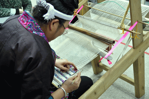 11月20日,杨甜应邀到我院艺术设计系对服装设计等专业的师生进行侗绣和织锦技法培训。杨老师将侗绣传承图案的意义、刺绣原理、技法及侗族织锦技艺与师生们展开交流,重点讲解金钱花和偶莲花的刺绣步骤,示范刺绣技法,并手把手教师生织锦织法。杨老师说:“以前侗家姑娘学刺绣没有专门的老师,得靠自己的模仿力、悟性和勤学苦练。” 看到青年学子们认真学习的劲头,杨老师欣慰感叹: “民间技艺不会失传!” 。