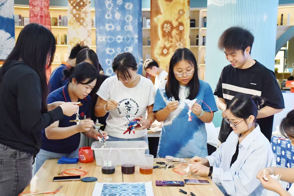 最激动人心的时刻莫过于解开束缚,在展开染布的那一刻。匠心大厅内惊叹声此起彼伏,如同开启一个个“色彩盲盒”:有的呈现出如冰裂纹般的清冷美感,有的绽放出放射状的星芒,还有的宛如层叠的繁花。留学生们兴奋地展示着自己的亲手制作的扎染方巾,用共同的语言交流着折叠心得和捆扎技巧的独特发现。小小一方扎染方巾,超越了国籍的界限,成为连接中外学子、共享传统技艺乐趣的无形纽带。