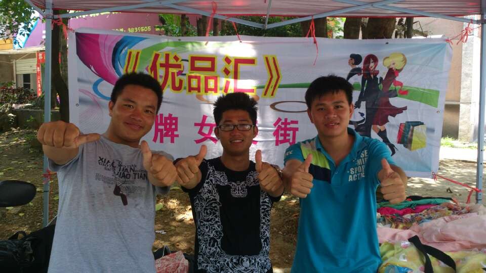 林福坤(中)和他的两位同班同学在服装经销点