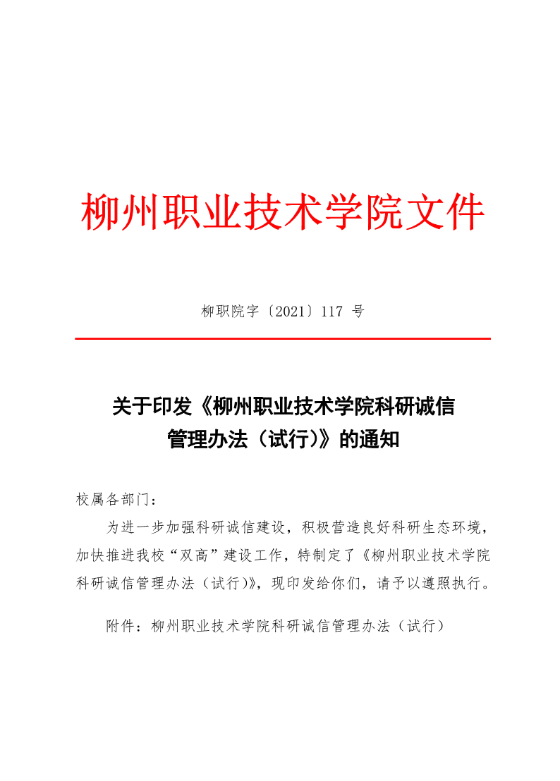 柳职院字〔2021〕117 号 关于印发《柳州职业技术学院科研诚信管理办法(试行)》的通知 来源: 发布时间:2021-12-20 09:42:19 浏览次数: 次 【字体:小 大】 终审:科研处 分享到: 【打印正文】