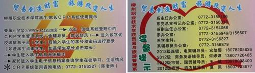 另外,该系为新生及家长精心设计制作了温馨卡片,给予温馨提示,以确保家长及新生顺利报到。卡片的一面印有系领导、各科室办公电话以及各专业辅导员的联系方式,许多学生和家长都连声称好,认为温馨卡片发送得非常及时。一位家长说:“我正愁孩子刚来学校遇到事不知道找谁,有了这张温馨卡,联系老师就方便多了,我们家长也可以随时了解孩子的情况了。”卡片的另一面是“学生/家长CRP系统使用提示”,以此向新生及家长推广学院新近投入使用的CRP系统,方便他们今后的学习和生活。一张小小的卡片,透露出贸易与旅游管理系对新生无微不至的体贴和关怀,体现了该系时时为新生服务、处处为新生着想的迎新服务宗旨。(文/陈月明 朱汝群 图/陈月明)