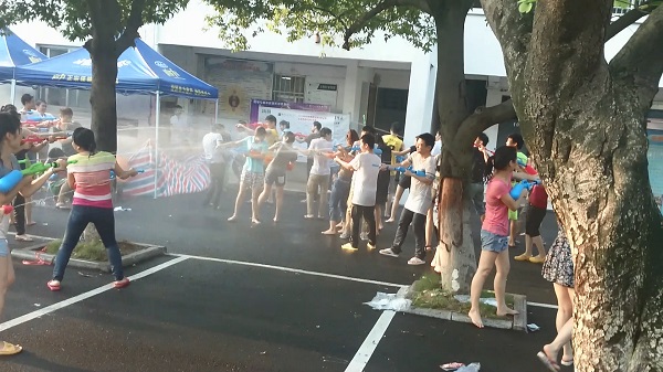 6月1日下午18时,贸旅系学生会组织120余名学生在达理楼旁开展“回忆童年,快乐你我”水仗活动。该系党支部书记牛永惠、学生科科长陈月明、分团委书记覃慧川、辅导员吴鹏为本次活动打响了“第一炮”。