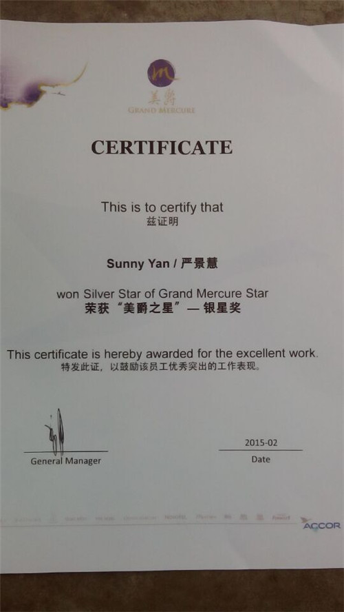 “美爵之星—银星奖”是客人对待员工服务的认可,也是雅高集团对员工的认可,严景慧同学本着雅高的基本服务精神,在实习期间她所接待的每一位客人,无论什么时候,都以细心、周到、热情地服务到最后一刻,为客人留下了深刻美好的印象。正是该实习生优质的服务和积极的工作心态,她2月份共得到客人12次的书面表扬信,雅高集团给严景慧发了“美爵之星—银星奖”。