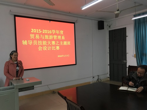 新闻网消息(通讯员/贸旅系 吴鹏)贸易与旅游管理系为提升辅导员队伍的职业能力,贯彻学院2015-2016学年辅导员职业能力大赛精神,1月7日中午12时,该系全体辅导员于达理楼303会议室开展“贸旅系主题班会设计大赛”初赛,该系党总支书记牛永惠、学生科科长陈月明、学生专干陈晓萍担任本次大赛的评委。