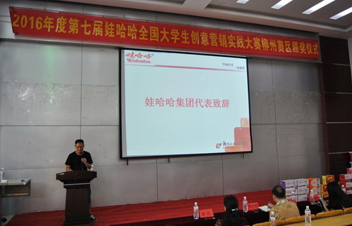 新闻网消息(文/贸易与旅游管理学院 蒙莉丝 图/贸易与旅游管理学院 唐铁骊)9月23日下午,2016年度第七届娃哈哈全国大学生创意营销实践大赛柳州赛区颁奖仪式在博闻楼110教室盛大举行。该院副书记陈月明、副院长谭欣、杭州娃哈哈集团广西拓展队代表王宏博先生、马磊先生、崔曼玲女士,与该院市场营销团队的全体教师、2014级市场营销专业的全体同学,共同出席了颁奖仪式。