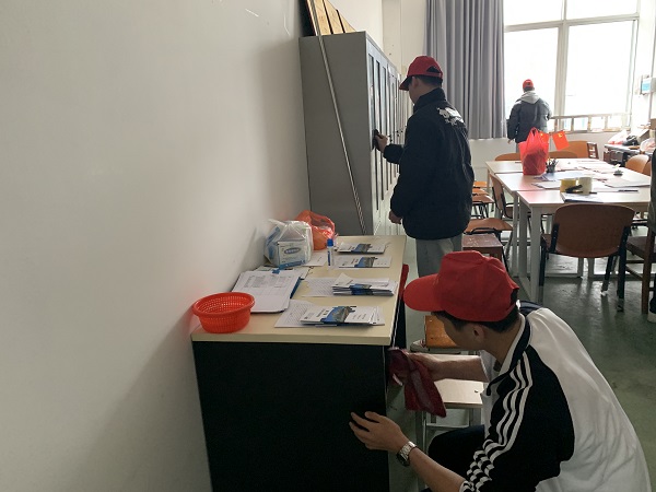 理论学习后,全体同学在班委的号召下分成两组进行志愿服务活动。一组同学拿着扫昂、簸箕、垃圾袋等清洁工具积极投入到清扫崇文楼及清洁食堂的工作中;另一组同学来到D区食堂,主动帮助食堂工人做清洁工作,擦拭餐桌,清扫地板,收拾餐具,刷洗碗筷。过程中,同学们个个争当活雷锋,发扬吃苦耐劳的精神,不怕脏、不怕臭、不怕累,将死角清扫干净。通过同学们的艰辛劳动,崇文楼及D区食堂被同学们打扫得干干净净,教师和食堂阿姨们对同学们的行为赞赏有加。