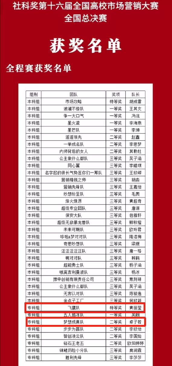 新闻网消息(文/贸易与旅游管理学院 蒙莉丝 图/贸易与旅游管理学院 余小艳)2025年7月4日,社科奖第十六届全国高校市场营销大赛全国总决赛结果重磅揭晓:我校贸易与旅游管理学院市场营销专业学生团队“飞鹰队”一举摘得全国总决赛专科组唯一特等奖、“梦想成真队”荣获二等奖,实现我校在该项赛事上的三连冠(第十四、十五、十六届)!指导老师蒙莉丝获“营销教学名师”、余小艳荣获“优秀指导老师”称号;“飞鹰队”队长黄丽莹获得“最佳领导力”个人奖项;学校获优秀组织奖。