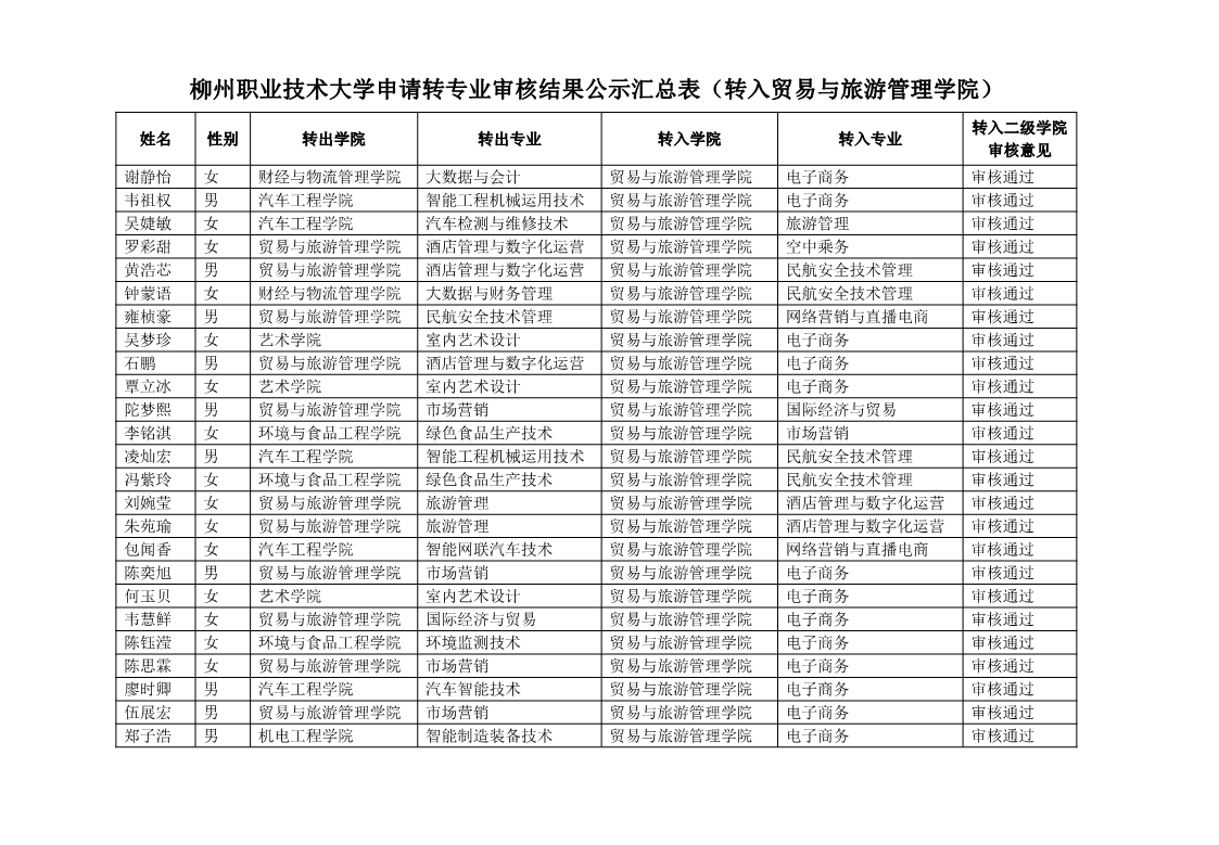 根据《柳州职业技术大学学生学籍管理规定(试行)》(柳职大教字〔2024〕1号)、《柳州职业技术大学学生转专业管理办法(试行)》(柳职大教字〔2024〕2号)有关规定,经学生个人申请,学校相关部门审核,现对转入贸易与旅游管理学院的转专业审核结果进行公示,具体名单见附件。公示时间为2024年10月9日-10月11月。