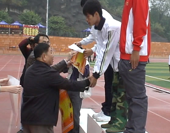 中午时分,冒着零星的雨点,学院领导朱伟才、石令明、阳旭、熊文华、林若森、院长助理敬志轩与各系部领导及全院师生一起出席了闭幕式。此次运动会的总裁判长李培庆向大会宣读了取得优异成绩的单位和个人名单以及破学院纪录的赛项,念到名字的系部不时以兴奋的欢呼声热烈回应;在催人奋进的音乐声中,学院领导分别给获奖的系部及个人隆重颁奖。