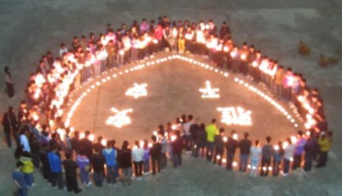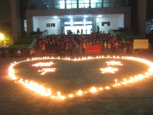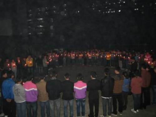 4月22日晚21时30分,汽车工程系学生120余人在竞择楼前开展为雅安祈福活动。