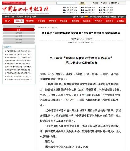 从中国高职高专教育网获悉:我院被教育部国际合作与交流司、教育部职业教育与成人教育司确定为“中德职业教育汽车机电合作项目”第三批试点院校之一。该项目落户到我院汽车工程系。