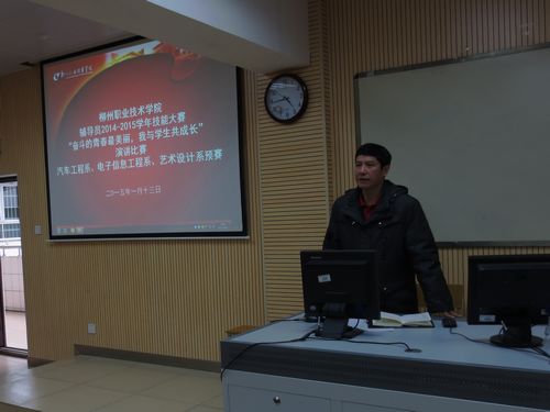新闻网消息(通讯员/汽车工程系 唐艳 图/电子信息工程系 莫东平)为进一步加强辅导员队伍建设,提高辅导员的职业技能和工作水平,引领辅导员队伍向职业化、专业化方向发展,同时也为了向即将举行的学院辅导员技能大赛之演讲比赛决赛输送优秀选手,2015年1月13日下午3点30分,我院汽车工程系、电子信息工程系、艺术设计系三系在博闻楼412教室共同举办了辅导员演讲比赛预赛,本次预赛由汽车工程系承办。电子信息工程系副书记黎晓灵在比赛现场指导,评委由学生科科长唐艳、卢岚岚、阎志斌三人担任。