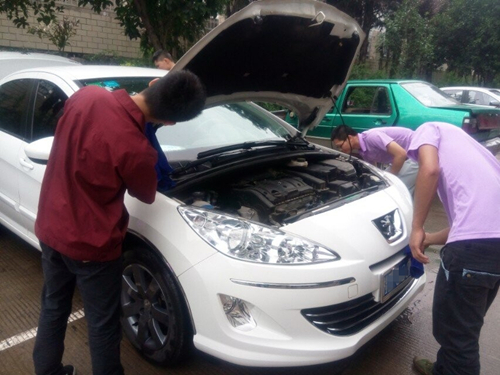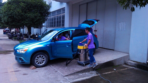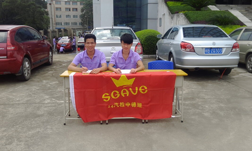 由于提前通过邮件和短信对此次活动进行了宣传,活动一开始就有不少车辆停在竞泽楼前等待清洗。活动现场,设有专门的接待台和简易的顾客休息区,活动分别设置了两个场地,可同时为四辆汽车清洁。本次活动负责人、14级中德班班长梁宽同学介绍,洗车标准严格参照汽车美容中心的程序来操作,洗车前先让车主填写车辆的相关信息,然后对车辆的车身外观、两油一液等情况进行检查,并及时记录下车辆的异常情况。洗车过程中,至少需要经过6道工序,首先,用清水将车身清洗一遍;第二,给车身上涂抹上洗车专用的洗车液,静置过几分钟后再用水冲洗干净;第三,用大毛巾把水擦干;第四,用小毛巾仔细地把边边角角残留的污垢擦干净;第五,吸尘和清洗车内的脚垫、坐椅;第六,擦拭车内的仪表盘、车窗玻璃等。洗车后,还让车主对车辆清洗情况和学生在洗车过程中的职业素养进行评价。