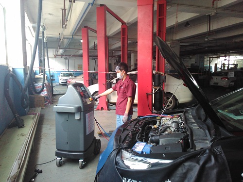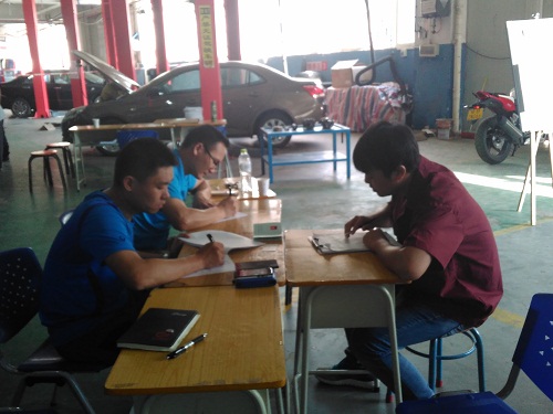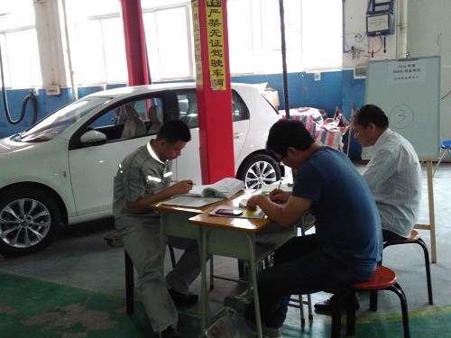 结业考试的学生需要通过五个工位(发动机无动力输出并发出异响、空调不工作、无法启动-油泵故障、发动机运转不良,车辆无法启动-CAN故障)的考核。每个工位分别由两位参加过SGAVE项目考官认证的教师担任考官。每个工位需要完成任务分析、任务计划、任务实施、任务检查四个步骤,耗时75分钟。每位学生的考试持续一整天,考试强度非常大。