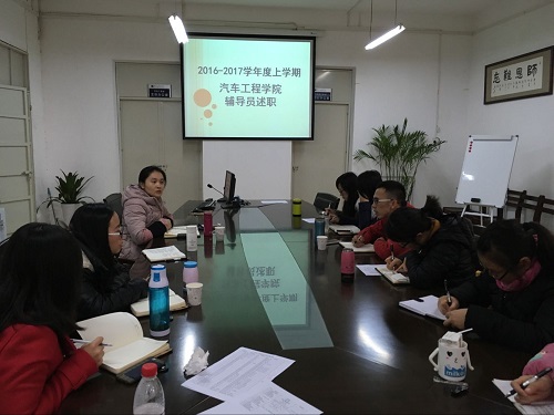 新闻网消息(文、图/汽车工程学院 陈俊如)为了让辅导员对一个学期的工作及各方面表现进行全面回顾,从工作实践中总结成绩和经验,发掘工作亮点,找出缺点与不足,不断提高工作质量和效率,汽车工程学院于1月19日上午在行健楼300会议室举行2016-2017学年度上学期辅导员述职总结。学院党总支副书记吴星、 学生科长曾志、学生专干陈俊如及全体辅导员参加了本次会议。