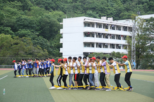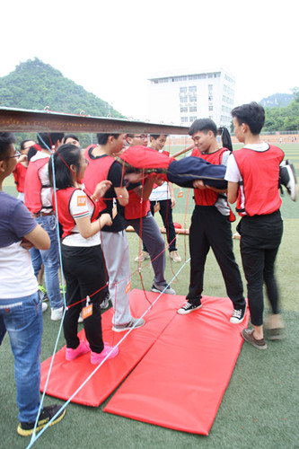 素质拓展在韦雅琴、黄碧莹、伍帅三位辅导员的带领指导下开展,入党积极分子被随机分为3个小组,素质拓展活动包括热身运动、团队展示、比赛竞技和分享总结几个部分。在素拓竞技部分中,同学们完成了“神笔马良”,“大脚板”和“穿越电网”三个活动。在“神笔马良”活动中,每组成员紧拉绳子末端,在不接触毛笔的情况下,按要求书写社会主义核心价值观,考验各组组员的协作沟通能力;在巨人脚步活动中,各组13位组员需要将自己的左右脚绑在一起,完成前进、后退及穿越障碍物的任务,考验了组员的默契配合能力;在穿越电网活动中,所有组员在规定时间内,从电网的一端穿越至另一端,需要组员们合理分工、科学决策和相互信任才能全部顺利通过电网。比赛过程中,组员们积极参与,精心策划、勇于克服困难、团结互助,整个运动场充满了欢笑和呐喊声。