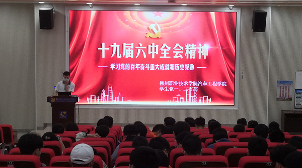 新闻网消息(文、图/ 汽车工程学院 伍帅)为深入学习贯彻党的十九届六中全会精神,不断加强和改进大学生思想政治教育,提高大学生思想政治素质,激励全体党员树立担当作为意识,汽车工程学院一支部、二支部在官塘校区T4-D401教室开展了主题为“同心向党•永远跟党走”的学习党的十九届六中全会精神主题党日活动。