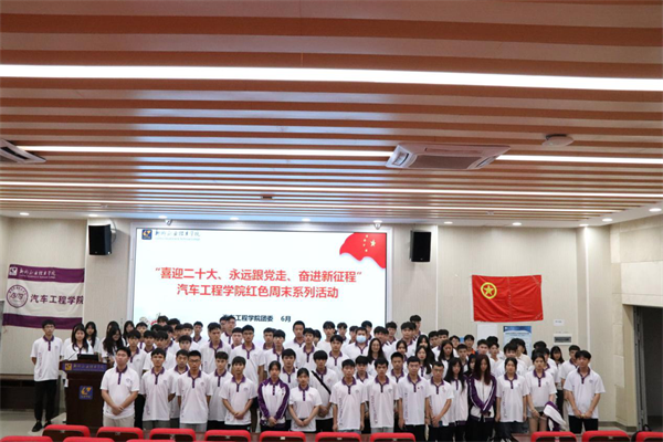 新闻网消息(文/汽车工程学院 陶敬福 图/汽车工程学院 韦双甜)为迎接党的二十大胜利召开,团结带领广大青少年坚定不移听党话、跟党走。2022年6月12日,汽车工程学院团委在官塘校区T4-D401会议室开展“喜迎二十大、永远跟党走、奋进新征程”主题周末红色教育实践系列活动。2021级青马班学员与新团员共计80余人参加此次教育实践活动,汽车工程学院团委副书记莫智富做活动主持。