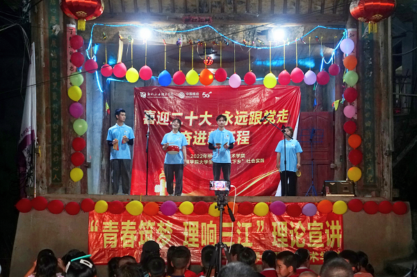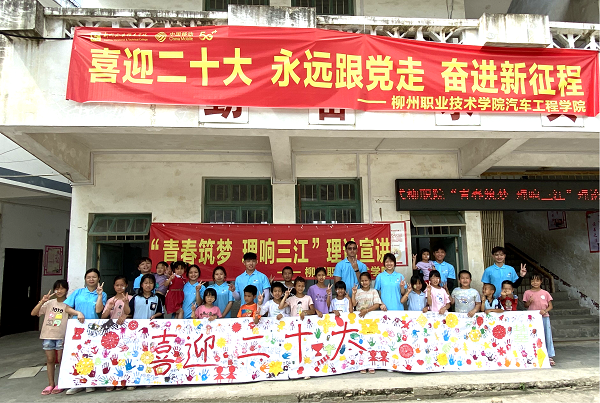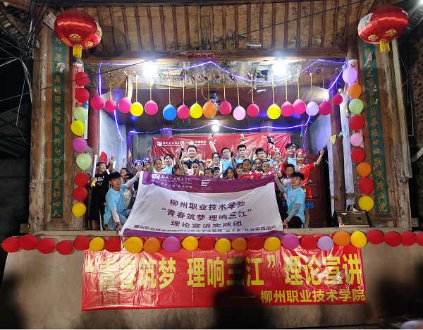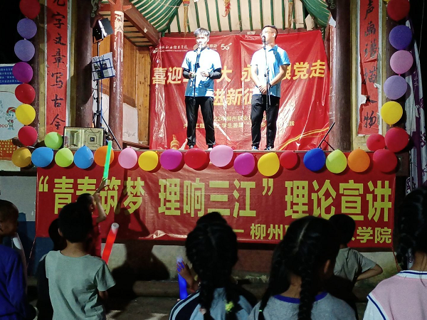 汽车工程学院“青春筑梦 理响三江”理论宣讲实践团以三江侗族自治县知了村为依托,通过线上直播、线下多种方式宣传红色文化,取得良好反响。7月13日-14日,宣讲团将“思政小课堂”与“社会大课堂”相结合,深入基层,走上知了村小舞台,到人民群众中开展面对面、互动式宣讲。宣讲团以诗文朗诵、相声、三句半、党史问答及歌舞表演等形式,以习近平新时代中国特色社会主义思想、庆祝中国共产主义青年团成立100周年大会上的重要讲话精神、视察广西“4·27”重要讲话精神为主线,结合三江本土特色,为乡亲们带来两场精彩纷呈的红色文化主题下乡宣讲活动。15日,实践队开展“听党话 跟党走 红色教育伴成长”红色宣讲进校园活动,通过学、讲、问的学习教育模式与知了村小学生们互动式宣讲,以真实生动地红色故事为素材把党史学习教育引向深处。