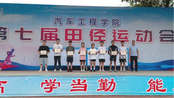 如果说短跑比的是个人速度,那么4×100米等接力项目比的就是团队能力。比赛场上,队友的肩膀成为彼此的依靠,友谊第一、比赛第二,在团结奋斗中超越自我,在齐心协力中赛出风采。下午6点,各项比赛成绩出来后,广播员一一播报了获奖班级与学生名单,韦耀业为获奖班级颁发荣誉证书。在本次运动会中,2020汽车检测与维修技术1班黄诗涛破我院男子铅球记录。2022新能源汽车技术3班兰柳情破我院女子三级跳与跳远记录。