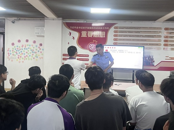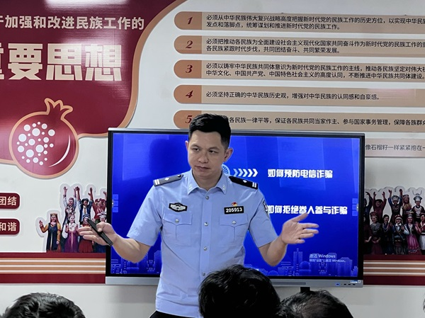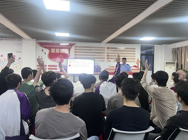 覃副所长通过校园真实案例,结合自身法治工作经验,生动的讲述了案例背后的诈骗风险,结合派出所为大学生精心准备的课件内容讲解反诈、反恐的重要性和禁毒的重要意义,他强调了民族团结是中华民族的生命线,是每个公民应当牢记在心、践行在行动的重要准则。他还指出,法治教育是现代公民的必修课,对于培养同学们的法治观念、增强法治意识具有重要意义。覃副所长更是与同学们进行了深刻的互动,不仅亲自教授“防身术”,亲自指导同学们下载反诈app,还讲解反诈app的正确使用方法,最后通过互动问答环节提高同学们对本次主题内容的学习积极性,给同学们带来了派出所准备的钥匙扣和手机支架等小礼物,受到了同学们热烈的欢迎和参与。