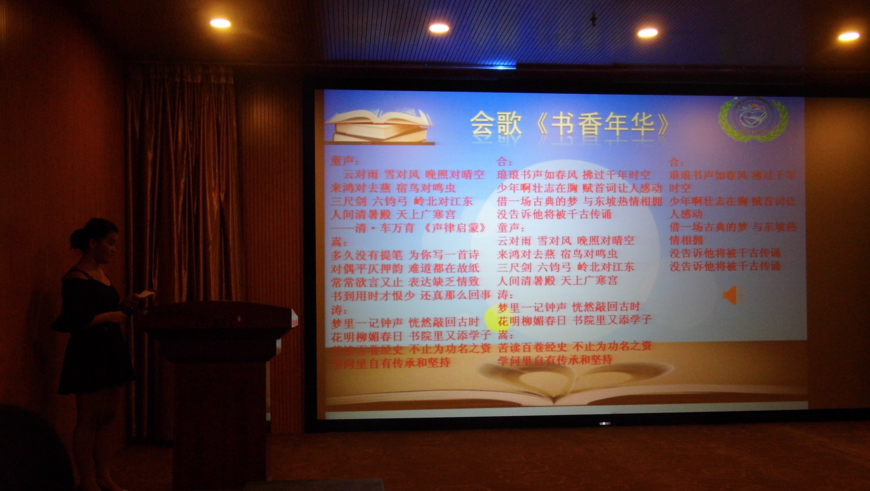 主持人以高昂的热情宣布了第一次全体大会的开始,随之全场发出响亮的掌声,全体人员聆听了琅韵读书会的会歌。