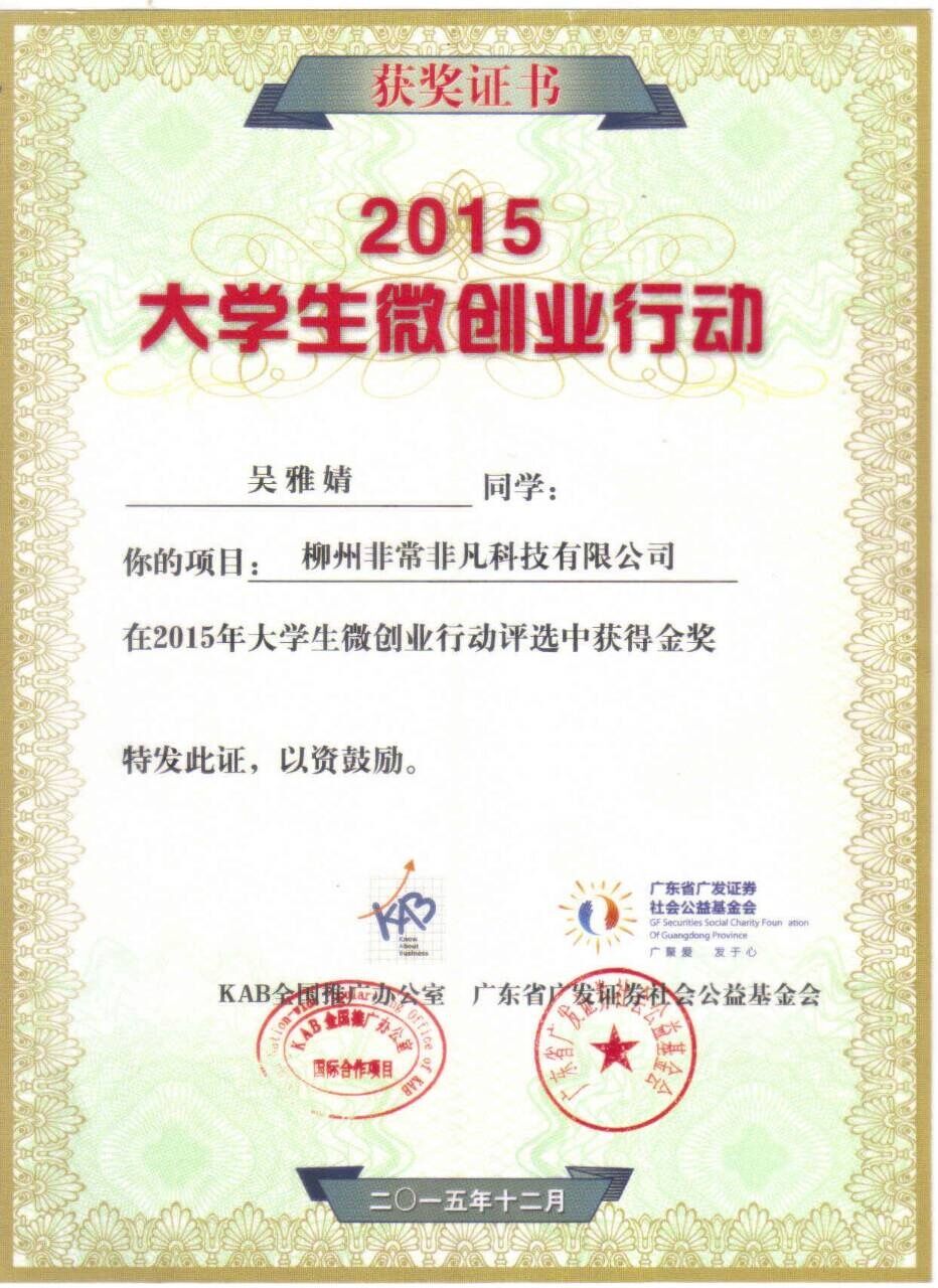 有了两次参加微创业行动的经验和心得,再加上自己的总结,在2015年10月她参加了“2015年大学生微创业行动”大赛,第三次写计划书时,吴雅婧没有悬念地拿了金奖,获得了两万元奖金。三次参赛均拿奖且一次比一次的奖金骄人,这让这位CEO信心满满。
