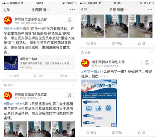 6月6日-21日,该支部利用新浪微博开通“两学一做”掌上“微”课,组织学生党员通过自主学习、集体讨论等形式备课。学生党员查阅大量资料,结合学习心得,把精华的学习材料整理成“微”课发布到微博中,与广大学生党员和入党积极分子共同学习交流。掌上微课能进一步引导学生的学习,符合当下学生的多元化、片段化的学习习惯,是推动“两学一做”学习教育从“关键少数”向广大党员拓展,从集中性教育活动向经常性教育延伸的有益尝试。二支部利用线上线下结合的学习教育方式,提升了教育合力,提高了支部党员们的学习效果。