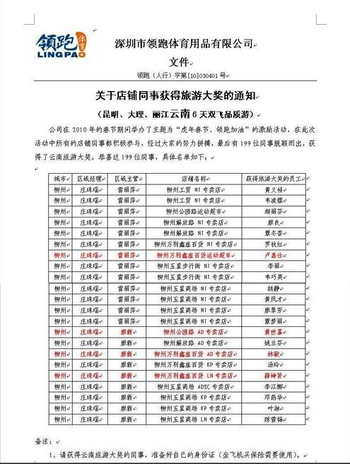 2010年春节期间,深圳市领跑体育用品有限公司举办了主题为“虎年春节、领跑加油”的工作激励活动,旗下在广东省、海南省、广西壮族自治区所有门店的职员都积极参与了活动,拉升销售业绩。最后199位职员脱颖而出,成为领跑公司最出色的销售人员,并获得了企业的嘉奖——云南6天双飞品质游。在这199位获奖的优秀职员中,有4位是我院经济管理系与深圳市领跑体育用品有限公司合作建立的“领跑班”学生,分别是2007级连锁经营管理1班的卢嘉仕、黄世喜同学,和2007级连锁经营管理2班的林敏、薛坤贤同学。这几位学生都只是在领跑门店中工作了仅仅数个月的实习生,却能和老员工一比高下,并且毫不逊色,成为领跑公司最优秀的销售人员之一。这充分展示了“领跑班”学生的优异素质,展示了校企合作带来的一加一大于二的效应。