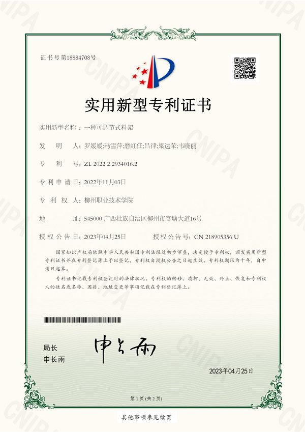 (文、图/财经与物流管理学院 罗媛媛)近日,财经与物流管理学院物流管理教学团队罗媛媛老师发明的“一种可调节式料架”喜获国家实用新型专利,这是学校管理类专业,也是该学院首次获得国家实用新型专利。