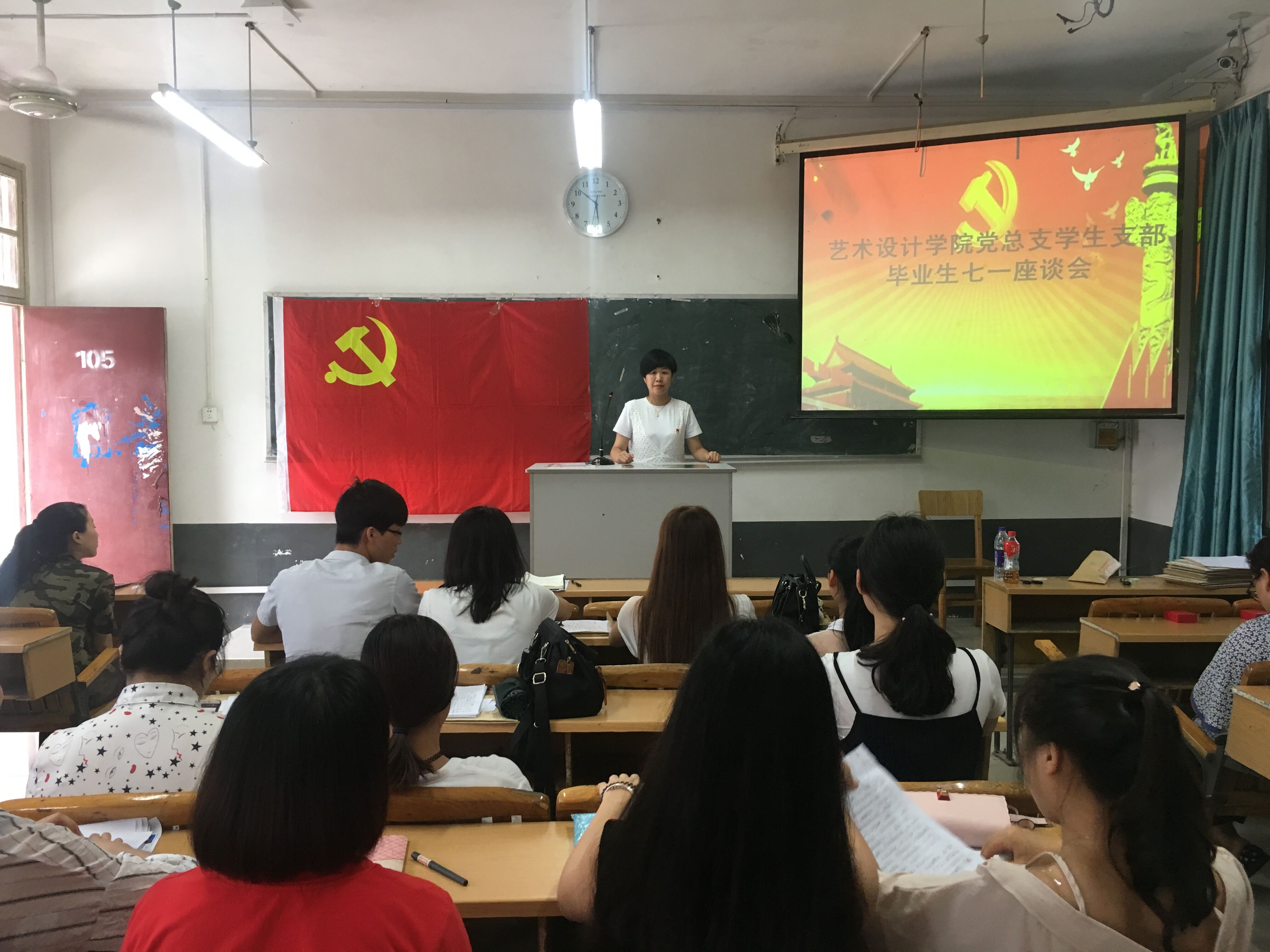 新闻网消息(文/艺术设计学院 王慧   图/艺术设计学院 白兰2017年6月30日下午,艺术设计学院党总支学生支部召开庆祝建党96周年暨毕业生党员座谈会。会议由学生支部书记白兰主持,学生支部全体党员参加座谈会。艺术设计学院党总支书记王慧发表讲话,并为即将走出校园的学生党员同志上了一堂“不忘初心跟党走”的主题党课,为毕业生党员上好“最后一课”。