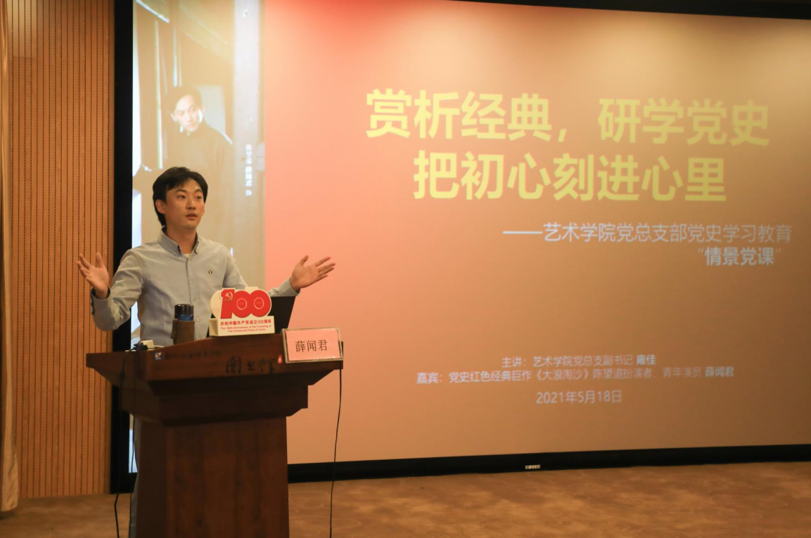 新闻网消息(文/艺术学院 杜昕 图/艺术学院 朱敬民)为推进党史学习教育走深走实,艺术学院党总支部将党课与影视作品情景相结合,2021年5月18日下午,在图书馆演播厅开展了一堂别具艺术特色的、“赏析经典,研学党史,把初心讲进心里”主题情景党课。党课由艺术学院党总支部副书记雍佳主讲,党史红色经典剧作《大浪淘沙》陈望道扮演者、青年演员薛闻君作为情景展现嘉宾。艺术学院全体在校教师和入党积极分子参加学习。