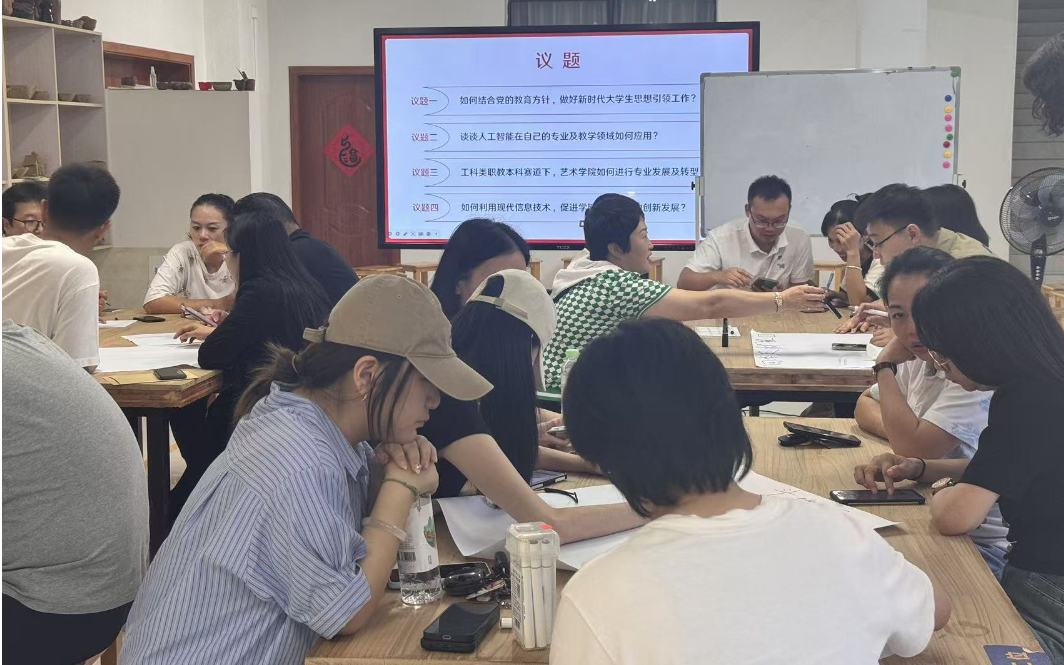 四个研讨议题分别涵盖了新时代大学生思想引领、人工智能在专业及教学领域的应用、工科类职教本科赛道下艺术学院的专业发展及转型,以及利用现代信息技术促进学院科研工作的创新发展等方面。各小组围绕选定议题,开展了激烈的头脑风暴,提出了许多富有创新性和可行性的建议。