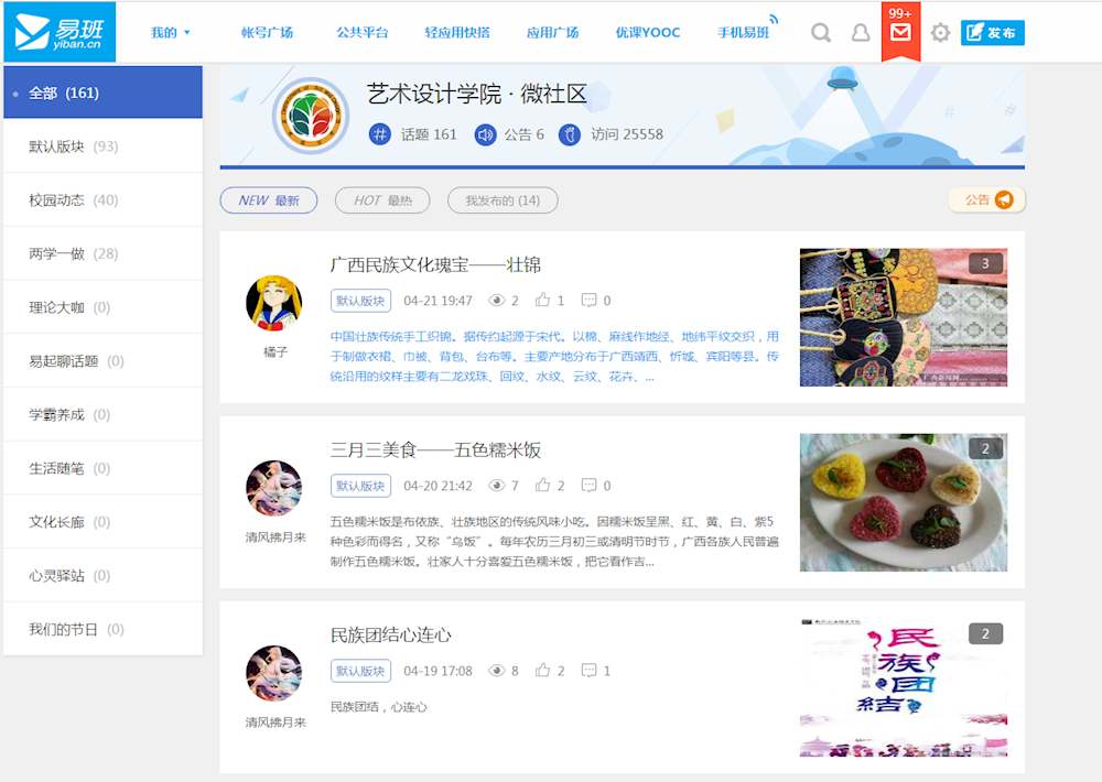 线上活动则利用易班平台开展宣传,艺术学院易班平台进行每天一更新,通过“民族团结”主题电子海报、民族风俗介绍、民族特色产品展示等形式进行广泛宣传,让民族风俗广为人知,全方位展示广西壮族自治区的民族特色。