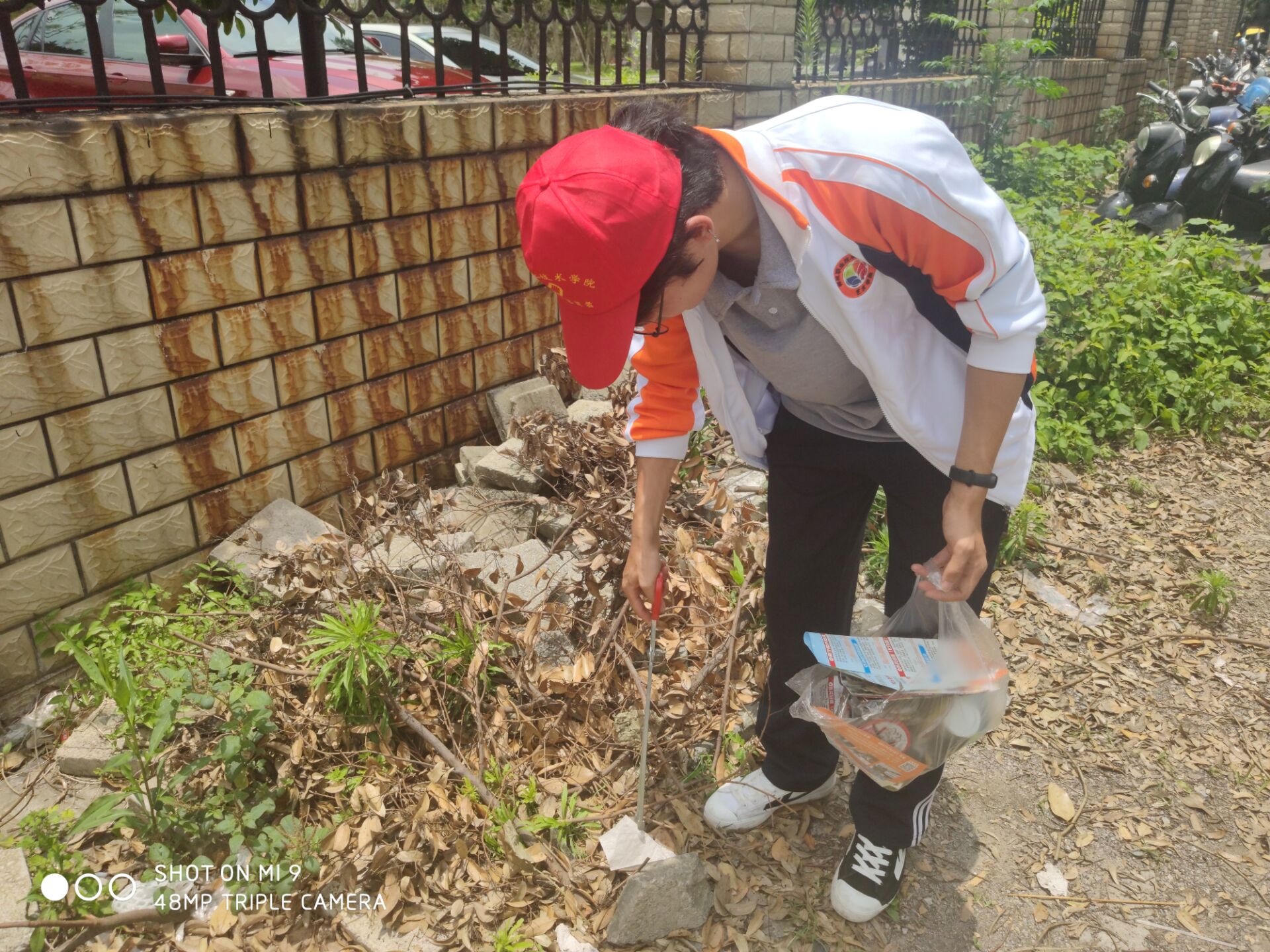 志愿者们穿着院服,戴着志愿帽,每个人手中拿着袋子,在学校大门口坡上至坡下马路两边进行打扫清洁活动。大家利用课余时间,顶着烈日,认真的查找路边、学校围墙边、宿舍围栏边,把一些塑料袋、废纸、塑料瓶等垃圾统一分类装进袋子扔进垃圾桶。临近一点半左右,此次志愿者活动也逐渐接近尾声,把同学们拾捡到的垃圾统一起来,共计五袋左右。