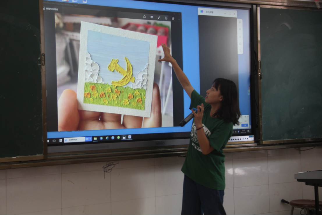 7月17日,队伍分团队面向小学生开展“传承非遗技艺,弘扬民族文化”扎染体验教育乡村行活动。柳州市新时代大学生宣讲团艺术学院分团成员韦莉婷为小学生进行宣讲壮乡小学近年来的环境改善和变化,期间小朋友感同身受,举手发言表达了切身体验到的幸福感。音乐团队带领小学生歌唱《我和我的祖国》,在歌声中加强对国家的热爱,提升了小学生们的民族意识。扎染团队开展了扎染技巧培训,讲解璀璨的民族非遗文化,小学生们在队员的指导下,运用扎染知识和技艺,完成个性十足的作品。掌握了扎染基本技巧后,队员带领小同学们尝试了长达10米的扎染长卷创作,大朋友小朋友相互配合,用水粉在长卷扎染的基础上进行艺术再创作,呈现了本次教学的成效。小同学们最后集中展示了两天的作品,在小老师们的赞许中进一步坚定了文化自信。