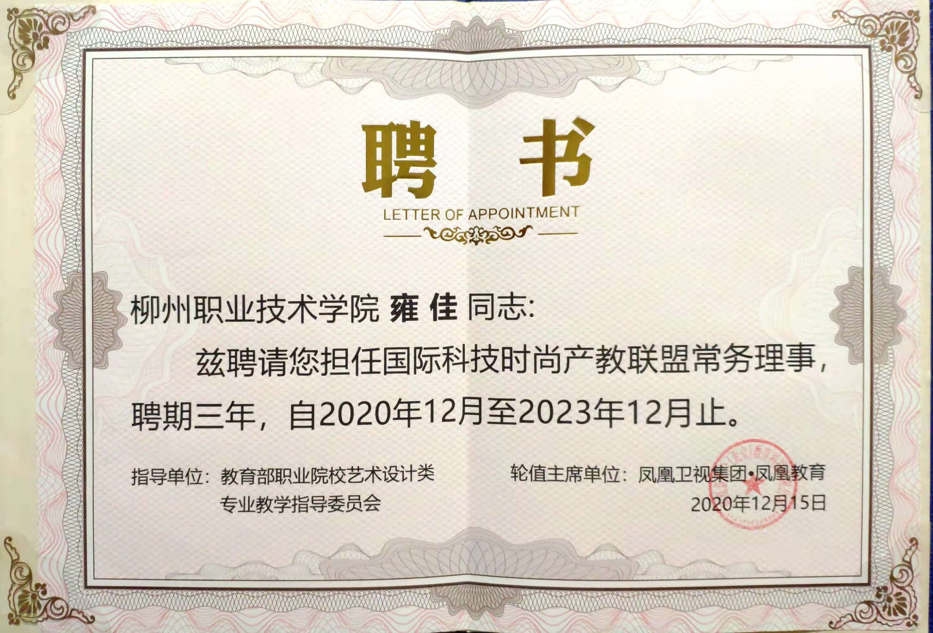 会议活动期间,由凤凰教育集团与教育部职业院校艺术设计类专业教学指导委员会共同发起成立“国际科技时尚产教联盟”。该联盟将共建国家级数字教学资源素材库与国际数字产业学院。还举行了国际科技时尚职业教育集团、全国虚拟仿真素材库、国家教学资源库、国际科技时尚产业学院等项目的启动与签约仪式。我校荣获科技艺术职业教育影响力院校提名奖,并当选为国际科技时尚职业教育集团理事单位;艺术学院雍佳和陆进2位同志受聘为国际科技时尚产教联盟常务理事。