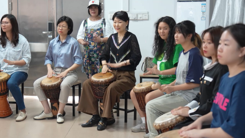 音乐心理疗愈是一种通过音乐来改善身体、心理、情感和社交问题的治疗方法。它可以帮助人们放松身心,减轻压力和焦虑,提高自我认知和自我表达能力,受众广泛。“鼓圈”活动是国际上很流行的团体音乐心理疗愈形式之一,其特有的声音和互动形式深受大家欢迎。本次活动由广西脑科医院音乐心理治疗师林桃主讲。林医生是中国抗癌协会会员、广西卫生心理援助队队员,具有丰富的音乐疗愈经验。活动分为知识讲堂和“鼓圈”体验两个环节。在知识讲堂中,林医生就音乐心理治疗的理论知识展开详细的讲解,并在授课过程中不断与现场师生互动,让师生在欢乐中察觉自我,体验情绪。在“鼓圈”体验环节中,大家跟随着林老师的音乐节拍和手势动作的快慢敲打乐器。“咚咚,咚咚咚”,敲打的力度与声音或逐渐增强,或慢慢减弱,或鸦雀无声,气氛轻松热烈。师生们在林医生的指导下轮流担任节奏引领者,让自己独有的节奏在“鼓圈”中奏响,也让大家听见自己心里的声音。大家跟随着律动活动起来,感受到音乐带的无穷动力。活动接近尾声,大家在刘斯然老师钢琴伴奏下轻声哼唱《小星星》,心情也随之恢复平静。师生们在活动中舒缓情绪、感受快乐,“从军训开始到现在,我都有点紧张,但是今天我在音乐中得到了释放”“我从来没有接触过乐器,今天第一次打鼓,感觉很不错。大家都很包容,不用在乎对还是错,感受节奏就对了,心情很舒畅”“当我听到别人跟着我的节奏敲击乐器时,我感受到了肯定和追随”……