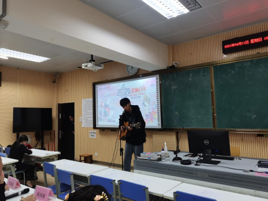 在主持人介绍了嘉宾,宣布评分规则后,比赛正式拉开帷幕。艺术学院可谓卧虎藏龙,既有拿着吉他潇洒弹唱的,也有清唱一展歌喉的,最亮眼的莫过于侗族姐妹花张珍和吴镇宇合唱的侗寨大歌——天星明月,唱出了少数民族特有的情怀。经过了两个多小时的激烈角逐,最终15名风格迥异、功底扎实的实力唱将入围了社湾校区区域选拔赛,他们将代表艺术学院的好声音逐梦于更大的舞台。