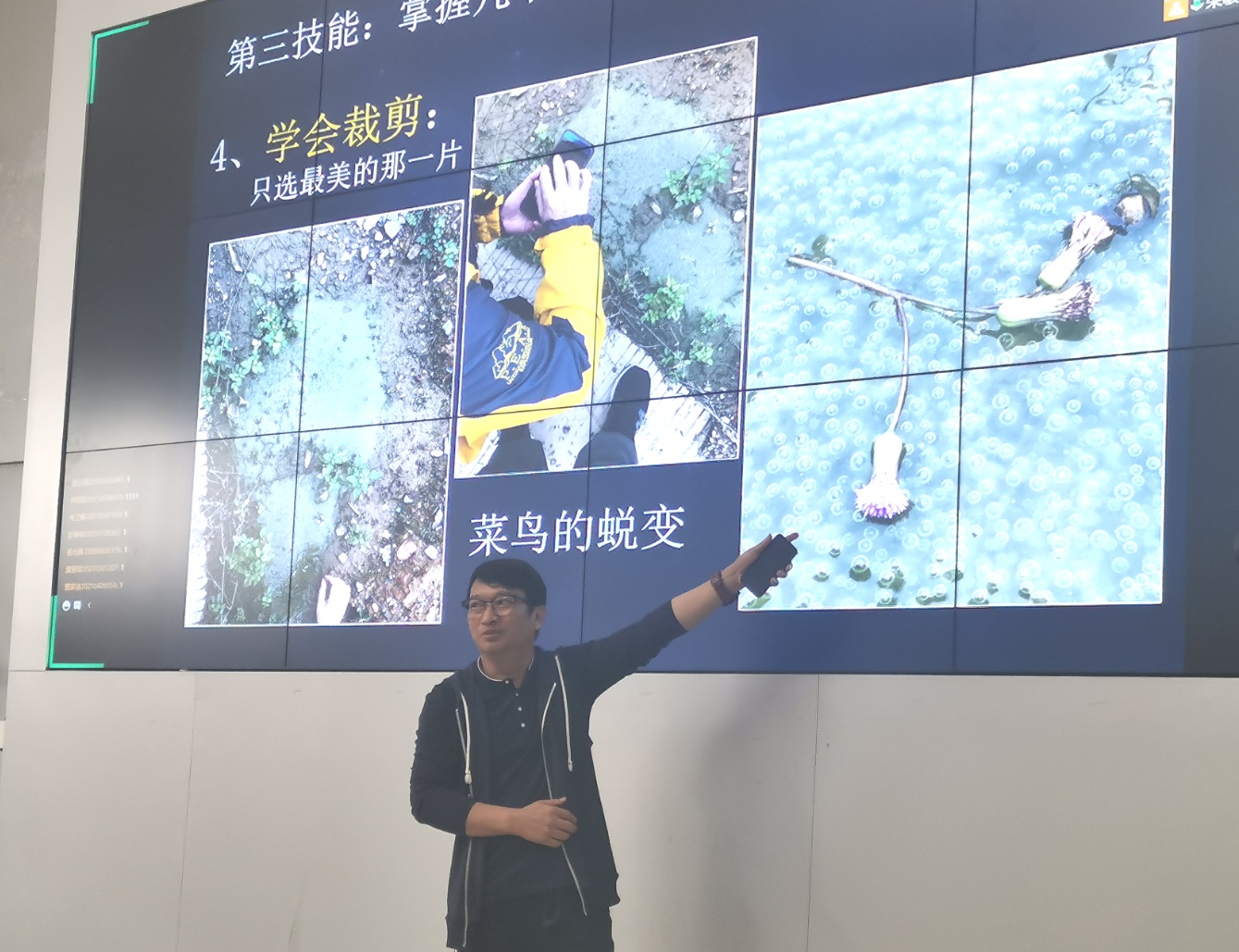 朱敬民老师结合大量日常所拍摄的图片案例展开讲解,向同学们传授了使用手机摄影时如何选择拍摄的角度、如何构图、如何突出主体的拍摄小妙招。为了增强讲座的趣味性,除了理论讲授,朱老师还利用现场的摄像机位,手把手指导来自线上和线下的同学们调光、选位。同学们也饶有兴趣地参与课堂互动,幸运观众赢取了小礼品。最后实战演练,上台演示的同学综合运用手机的常规功能拍出了惊艳的大片,引得现场阵阵掌声和线上观众的纷纷赞叹。