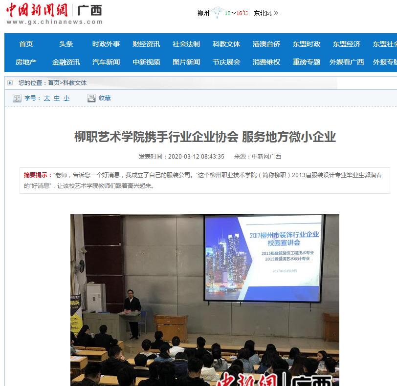 【中国新闻网】柳职艺术学院携手行业企业协会 服务地方微小企业 来源: 发布时间:2020-03-25 17:38:00 浏览次数: 次 【字体:小 大】 2020年,中国新闻网以《柳职艺术学院携手行业企业协会 服务地方微小企业》为题,刊发我院新闻。详情点击: http://www.gx.chinanews.com/kjwt/2020-03-12/detail-ifzumzav7887461.shtml?qq-pf-to=pcqq.c2c 终审:艺术学院 分享到: 【打印正文】