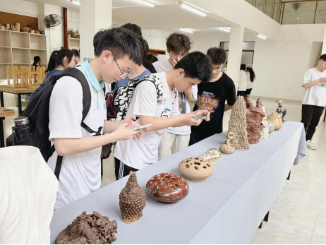 孙展航、邓丽两位老师针对艺术学院的学院概况及特色专业给同学们进行了细致宣讲,同学们认真聆听艺术学院的“自我介绍”,对柳职这一艺术天地有了初步了解。杜昕、刘强两位老师带领同学们参观了民族文化博物馆和陶瓷艺术研发应用中心,并向大家讲解了蜡染扎染及陶艺文化这两项民族工艺。在参观过程中,同学们对民族文化博物馆中精美的民族饰品展现出了强烈的兴趣,纷纷靠近玻璃展示柜仔细欣赏服装专业师生制作的精致服饰,赞叹蜡染扎染这一民族技艺的别致美感。在陶艺展品前,大家对形态各异的陶艺小摆件爱不释手,一致好奇软泥是如何从柔软形态变成栩栩如生的陶瓷制品的,带着求知欲,大家聚精会神倾听刘强老师讲解陶瓷制法,对陶艺设计过程的严谨工序叹为观止。同学们还参观木艺工坊、实训基地等特色教学场所,充分感受大学校园中的艺术魅力。