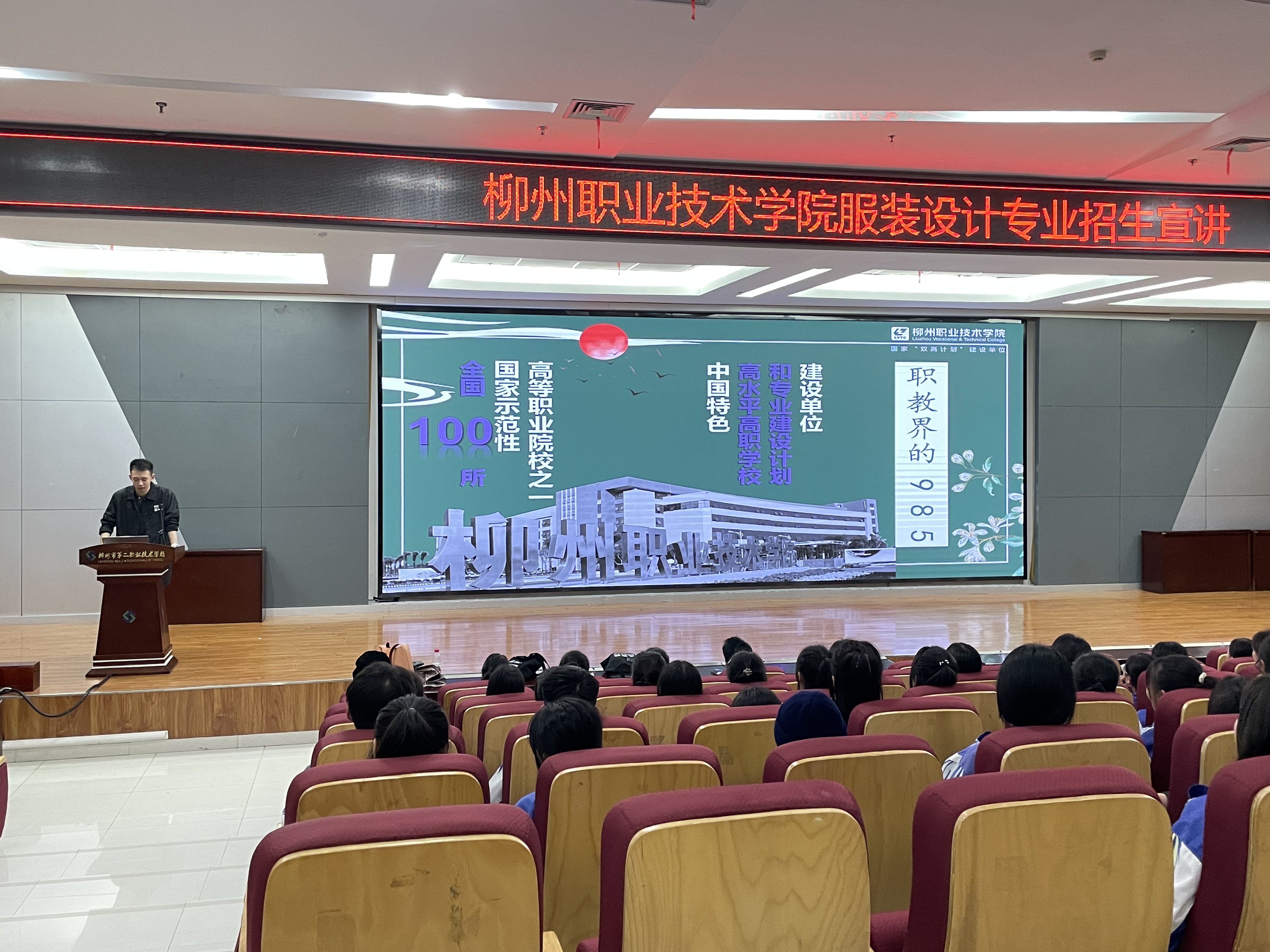 首先,艺术学院与柳州第二职业技术学校艺术设计系、南宁职业技术学院教师进行了中高职衔接工作研讨,对人才培养方案、教学科研、专业技能比赛等工作进行了深入交流。宣讲团队在李海辉和韩晶的引领下,参观了艺术设计系的非遗博物馆、服装实训基地和直播间,近距离了解二职校的教学实训情况。随后,艺术学院招生团队成员分三个会场进行招生宣讲。招生宣讲期间,各位宣传老师尽职尽责,首先为同学们介绍了柳州职业技术学院的整体发展情况,指导同学们如何登录网站填报志愿以及相关注意事项等;各专业课教师也分别讲解了本专业的学习以及未来就业趋势和方向,鼓励学生选择读适合自己的专业。